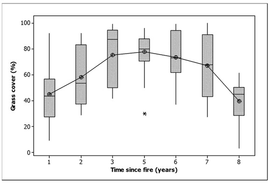 Grass cover related to time since fire. The median is shown by a horizontal line. The box contains two quartiles. The symbols are outliers. Means are joined by a line.