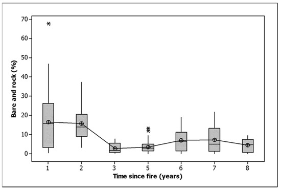 Bare ground and rock cover related to time since fire. Note that the one-year data includes observations in 2021 after burning that covered only 57% of the area within burned plots. Given that only half of the area of the burned plots was burned in 2021, an adjusted bare and rock cover at one year would be approximately 22%. The median is shown by a horizontal line. The box contains two quartiles. The symbols are outliers. Means are joined by a line.