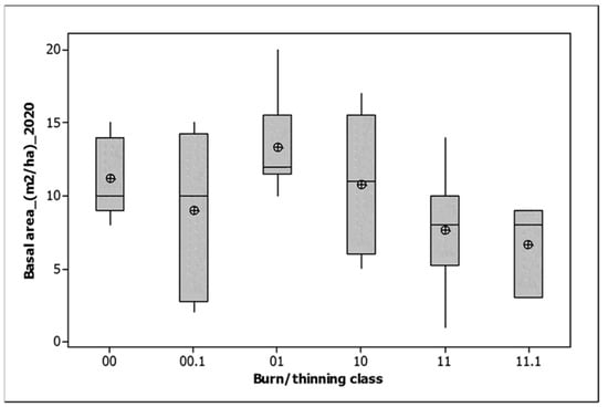 Total basal area by 2021 burn/thinning class for the 2020 monitoring. 00 = unburned, 00.1 = unburned and thinned, 10 = burned only in 2018, 01 = burned only in 2021, 11 = burned in both 2018 and 2021, 11.1 = burned in both 2018 and 2021 and thinned. The median is shown by a horizontal line. The box contains two quartiles. Means are shown by circles.
