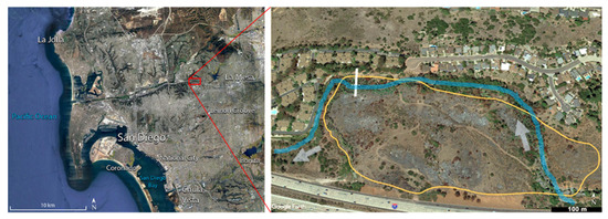 Alvarado Creek is one of the nine tributaries encompassed within the San Diego River watershed located in San Diego, California (Figure 1). The climate in San Diego is Mediterranean with consistent temperatures throughout the year. Precipitation mainly occurs during late November through March but is variable from year to year. The Alvarado Creek watershed consists of developed urban land comprised of residential, industrial, and institutional land uses. Sources of surface runoff to the watershed include Lake Murray, urban runoff, and nearby steep areas through concrete channels and culverts. The study reach consisted of native plants such as Artemisia californica and Muhlenbergia rigens in the uplands and dense invasive plant species such as Arundo donax and Washingtonia spp. in the riparian areas [12]. Prior to the fire, non-native riparian vegetation constricted the stream channel and contributed to flooding during precipitation events.