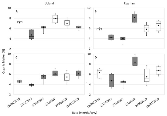 Organic matter box and whisker plots for the upland upper (A) and lower (C) and riparian upper (B) and lower (D) soil depths. Dates that are different from 26 October 2018 and statistically significant are shaded.