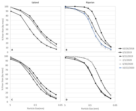 Generally, in the uplands, the percent finer by mass was more well-graded and distributed across all sieve sizes (0.075 to 4.75 mm), where larger percent finer occurred in the larger sieve openings and decreased with smaller sieve sizes (Figure 3A,C). Both locations generally contained high frequencies of medium and coarse sand particles (0.425 to 4.75 mm). However, the riparian soils were more poorly graded compared to the uplands (Figure 3B,D), especially for medium and coarse grain sizes for both layers in October 2018 and the bottom layer on 30 June 2020.