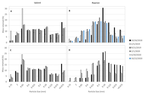 Percent of soil mass retained per sieve size for the (A) upland and (B) riparian upper soil depths and (C) upland and (D) riparian lower soil depths.