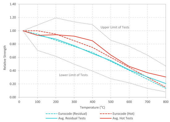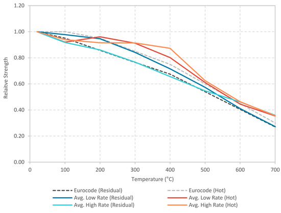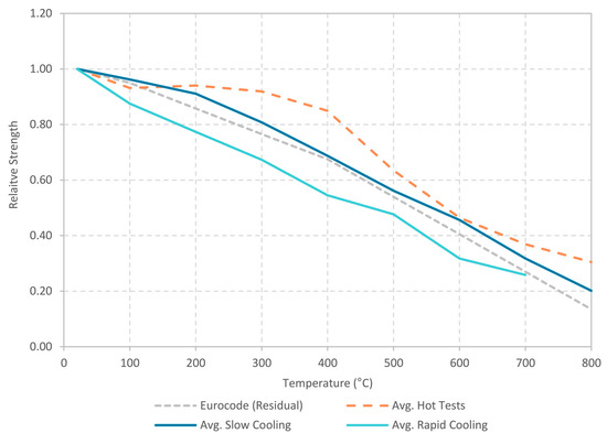 Figure 8 records the average strengths of the experimental work for direct comparison. The average profiles have been truncated at 700 °C due to a shortage of available tests beyond this temperature. The Eurocode prescribed profiles for hot and residual siliceous concrete are also given as a baseline [34,35].