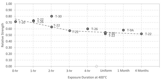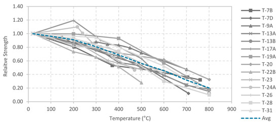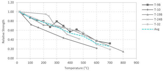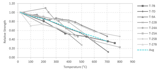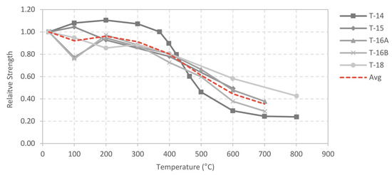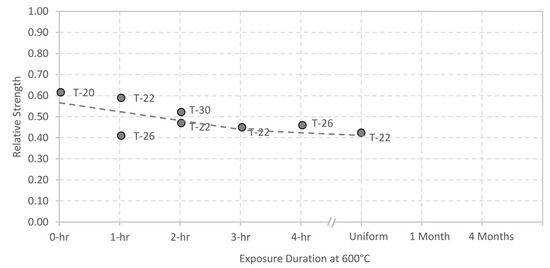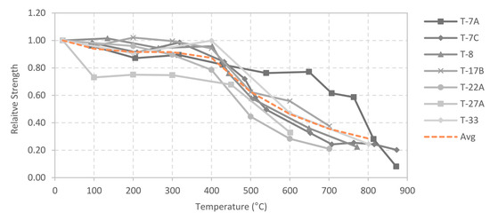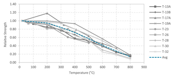 The results show that the majority of strength loss occurs early in the exposure process. Test T-20 with an exposure duration of 0 h, exhibited relative strength loss of 29% at 400 °C and 38% at 600 °C.