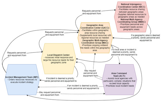 A conceptual diagram of the wildland fire resource allocation system in the US. Each hexagon represents an entity responsible for ordering and/or assigning resources to one or more of the other entities. A description of their responsibilities with regard to resource ordering and/or assignment is included within the hexagon. Entities higher on the diagram are responsible for management at a larger spatial scale. Arrows indicate the direction that requests and assignments flow. Dashed lines indicate requests and assignments associated with ACTs, which are typically only activated when there is a need to support multiple ongoing fires occurring in close proximity. There is a single national coordinating center, ten geographic area coordination centers (see Figure 1 for geographic area boundaries), and multiple local dispatch centers associated with each geographic area. There were three ACTs active in the US during the 2020 fire season and 59 Type 1 and Type 2 IMTs.