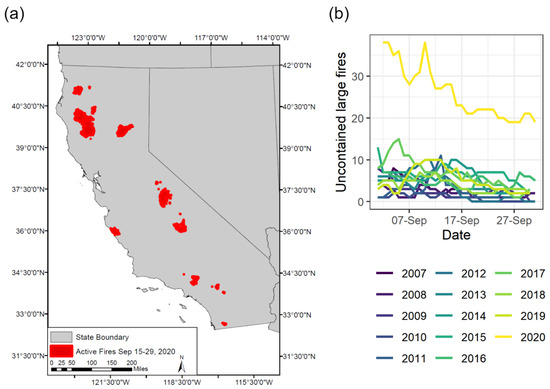 (a) Perimeters for active large fires active during the period of 15–19 September 2020 for the state of California. Data from the National Incident Feature Service [29]; map produced by Jon Rieck. (b) Number of uncontained large fires burning in the state of California daily, as reported in the National Incident Management Situation Report (IMSR) [27] during the month of September for 2007–2020. On the morning of 19 September 2020, the National IMSR reported that the active large fires in California had burned slightly more than 52,000 acres since the same time the previous day. The smallest of the fires was 575 acres (the Moraine fire) and the largest was 737,829 acres (the August Complex). For more specifics on the fires burning, see the National IMSR reports [27].