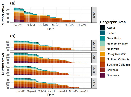 (a) The number of Interagency Hotshot Crews expected to be available for wildland fire assignments each day in the late season of 2020. Data collected manually by Shane Greer in 2020. (b) The number of hotshots available for wildland fire assignments each day in the late season of 2016, 2017, 2018, and 2019. Data aggregated by the Interagency Hotshot Steering Committee.