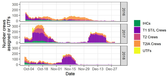 Figure 5 shows the daily number of crews assigned to fires in ROSS during October, November, and December of 2016, 2017, and 2018. As previously mentioned, in 2020, over half of the T1 ST/L crews were unavailable due to the COVID-19 pandemic. With most IHCs approaching their season-end dates (Figure 4) in addition to the absence of the T1 ST/L crew, this depiction of previous late-season crew usage (particularly the high reliance on ST/L crews in the past) also confirmed the substantially limited availability of crews in late 2020.