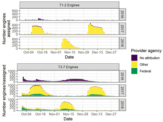 The daily number of structure (T1–T2) and wildland (T3–T7) engines assigned to wildland fires in the United States between 1 October and 31 December in 2016, 2017, and 2018.