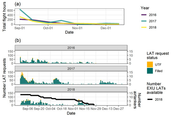 (a) The number of flight hours recorded in Aviation Business Systems (ABS) during the late season in 2016–2018 for large airtankers. Hourly use is aggregated by half-month periods. (b) The daily number of requests for large airtankers (LATs), both filled and “Unable to fill” (UTF), from 2016 to 2018. In addition, the number of LATs on exclusive use contracts (EXU) available for dispatch to wildland fires daily from the Forest Service in 2018.