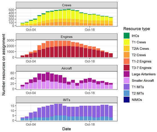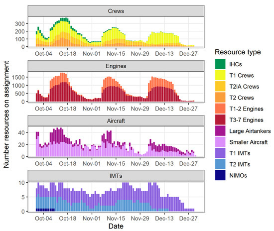 The assignment data were further stratified by resource type, as different types of crews, engines, aerial resources, and IMTs have differing capabilities. There are four types of crews tracked: (1) Interagency Hotshot Crews (IHCs), (2) Type 1 State and Local (T1 ST/L) crews, (3) Type 2 Initial Attack (T2IA) crews, and (4) Type 2 (T2) crews [42]. The T1 ST/L crews are primarily comprised of crews provided through the California Department of Corrections and Rehabilitation (CDCR). There are seven engine types, which we classified into two classes. Type 1 and 2 (T1–T2) engines are the largest of engines, are typically confined to use on paved roads, and are often involved in structure protection. Type 3, 4, 5, 6, and 7 (T3–T7) engines are smaller vehicles that may be used on unpaved roads and for tasks that may not directly involve structure protection [42]. Airtankers deliver water or retardant and are typed according to aircraft volume capacity. Very large (>8000 gal), Type 1 (3000–5000), and Type 2 airtankers (1800–2999) are grouped in our analyses and labeled as “Large Airtankers”. “Smaller Aircraft” include Type 3 (800–1799 gal) and Type 4 airtankers (<800 gal) [43]. IMTs are also classified by type, indicating the level of complexity they are qualified to manage. Type 1 (T1) IMTs manage the largest and most complex wildfires. Type 2 (T2) IMTs are also highly qualified, though not as highly staffed or trained as T1 IMTs, and they also manage major wildfires. The National Incident Management Organization fields four T1 Incident Management Teams (NIMO), which we tracked separately from the other T1 IMTs [42].
