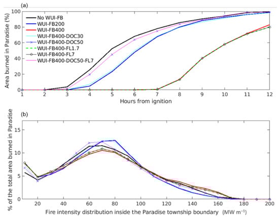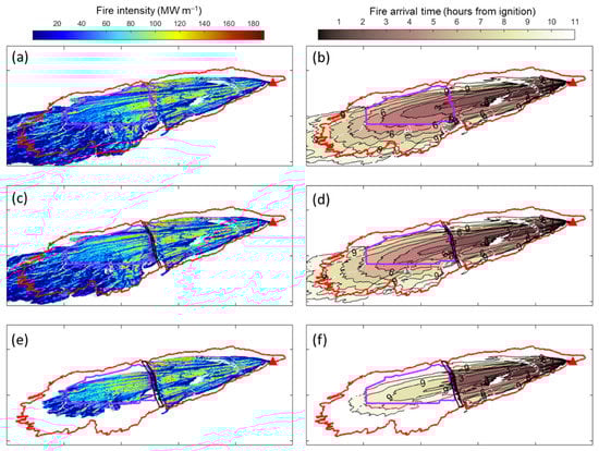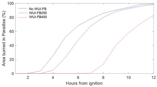 3.2. Impact of WUI Fuel Breaks on Downstream Fire Behavior