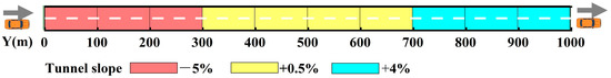 A medium-length, double-hole undersea tunnel, built using tunneling shields in the city of Macao, was selected in this study. The tunnel is a one-way, two-lane tunnel with a shield part 1000 m long, 12 m wide, and 8 m high, in the shape of a horseshoe for the space above the road with a sectional area of 71.7 m2, without cross passages between the two tunnel holes. The road near the inlet and the outlet is sloped. The schematic diagram of the shield part of the tunnel is shown in Figure 1, where Y = 0 m denotes the entrance of the shield part, while Y = 1000 m denotes the exit of the same.