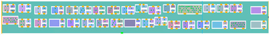 Pathfinder software, which has been commonly used in the field of fire evacuation [29,30], was used to construct the evacuation model in this study and was used in steering mode to consider the passenger collisions [31]. According to the traffic flow data that will be mentioned in Section 2.2.2, assuming that all blocked vehicles are randomly distributed and the distance between vehicles is 1 m, a total of 310 vehicles and 1870 passengers could possibly be trapped in the tunnel. The average shoulder width of passengers was set to 0.5 m, in line with the relevant fire safety standard. Evacuation slides on the side walls of the tunnel were simplified as doors to the outside. In addition, passengers could flexibly choose to evacuate from the evacuation slide or tunnel entrance according to the distance or flow without crossing the fire source. The partial evacuation model is shown in Figure 3. The white closed lines denote vehicle outlines, the green points denote passengers, and the short green line below denotes an evacuation slide.