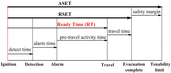 The evacuation process can be divided into two parts, the ready process and the travel process, which could be reflected in the composition of RSET. RSET is defined as the calculated time period required for an individual passenger to travel from their location at the time of ignition to a safe refuge or place of safety [25], which consists of the detect time, alarm time, pre-travel activity time, and travel time, as shown in Figure 4. For simplicity, the ready time (RT) is considered to be the time period required for the ready process.