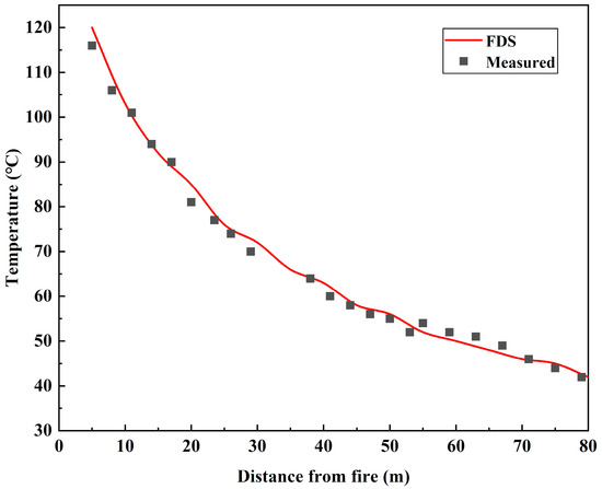 Since it is difficult to find experimental works with a similar fire scale and similar tunnel structure to this work, to verify the reliabilities of the simulation software and the grid calculation method in this study, using the same method of modeling, boundary condition setting, and grid calculating, to simulate a 0.75 MW combustion experiment in an 88 m-long channel carried out by Hu et al. [43]. The full-scale FDS model included the same tunnel structure, fire location, HRR, and the same sensor placements. The purpose of this section is to prove the feasibility of the software and modeling methods used, rather than to completely replicate the experiment, so the byproduct parameters related to the fuel type are ignored, and only the ceiling temperature data from the simulation and the experiment were compared. The ceiling temperature can comprehensively reflect the smoke diffusion and heat transfer process, and it can be regarded as a characteristic parameter for evaluating similar combustions. The ceiling temperature distributions within 80 m of the fire source were compared, as shown in Figure 5. The simulated data by FDS are represented by the red line, and the experimental data from Hu et al. are shown as black cubes.