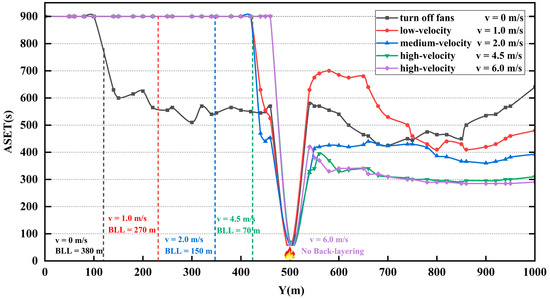 The influence of longitudinal ventilation velocity on ASET was discussed in this section. Distributions of ASET and back-layering length (BLL) at different longitudinal ventilation velocities of 0 m/s, 1.0 m/s, 2.0 m/s, 4.5 m/s, and 6.0 m/s are shown in Figure 6. The following results were obtained: