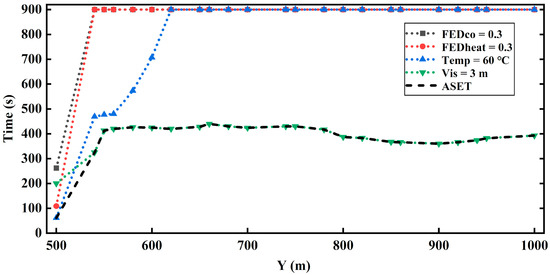 Figure 8. The downstream ASET distribution and the time when FEDCO, FEDheat, temperature, and visibility indexes reach the threshold at the velocity of 2.0 m/s.
