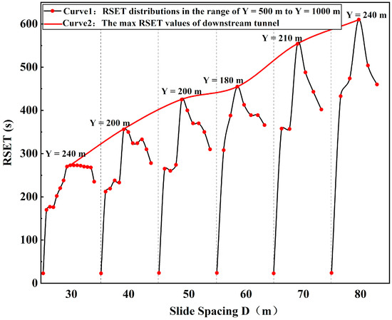 The influence of spacing and number of evacuation slides on RSET in different longitudinal ventilation velocities are discussed in this section. The RSET distributions on both sides of the fire source were similar because slides were symmetrically installed. The RSET distributions under conditions of different slide spacings (D) are shown in Figure 9. The RSET distributions of the downstream tunnel (Y > 500 m) when using different D values from 30 m to 80 m are shown as Curve 1, and the red dots denote the RSET values near the evacuation slides. The variation in the longest evacuation times for the entire tunnel (the max RSET values in Curve 1 for increasing D) are recorded as Curve 2.
