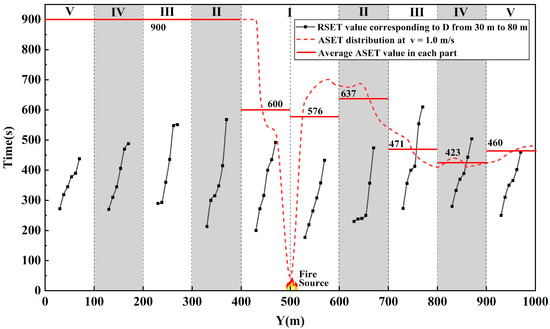 Further, to identify the slow evacuating area and the high-risk area of the tunnel, the tunnel was longitudinally divided into five areas, I, II, III, IV, and V, by the distance from the fire source. Each area had two parts, including a 100 m upstream part and a 100 m downstream part, as shown in Table 9. Taking the low-velocity ventilation mode as an example, the comparison of RSET distributions with the ASET distribution at the velocity of 1.0 m/s is shown in Figure 10. The ASET curve is the actual ASET distribution of the tunnel; the average ASET curve is the average ASET value in each part, which roughly reflects the overall situation in the part. The RSET curve represented the variation of the maximum RSET values when D increased from 30 m to 80 m in each part, the leftmost point represented the condition of D = 30 m, and each RSET value belonged to the passenger with the longest evacuation time in each part.