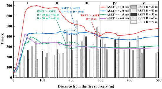 Comparison of RSET of different D with ASET of different velocities in the downstream area of fire source within 500 m.