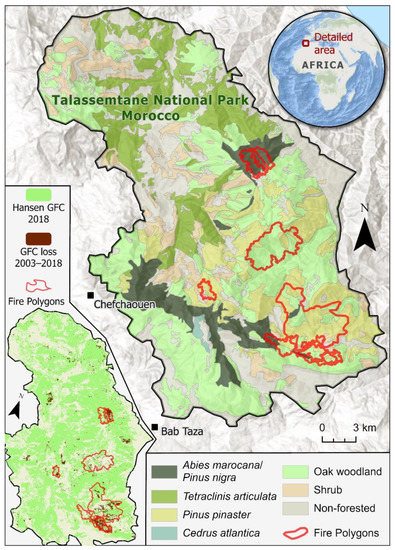 Talassemtane National Park with forested vegetation and fire polygons. Inset: Global Forest Change (GFC) map showing forested area, forest loss over the study period (2003–2018), and fire polygons.