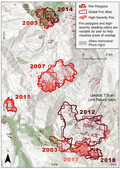 We used multiple sources of remotely sensed data to quantify the role of wildfires as a factor of forest loss over a 16-year period, 2003–2018 in TNP. We combined the Global Forest Change data, the Global Fire Atlas data, vegetation coverages provided by the Moroccan Department of Water and Forests, and processed Landsat satellite data, to determine the role of fire in overall forest change from 2003–2018. Our goal was not to detect every ignition on the landscape, but rather to identify relatively large/severe fires that were associated with detectable forest loss. A key challenge is that different data sets may have distinct resolutions, precisions, and definitions of “forest”, adding complications to comparisons. However, such issues are ubiquitous in the application of remotely sensed data. In our study, combining data sets can help forest managers better understand the current forest impacts in the park and highlight areas that are of high concern.