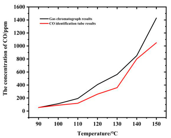 According to the past experience, we take the gas chromatograph detection results as the actual situation by default, but in the actual production process, the underground staff cannot use the gas chromatograph but use the CO identification tube, and the identification tube detection results and the results measured by the gas chromatograph have certain errors. In order to find the relationship between CO identification tube and gas and for chromatograph results to be closer to the actual situation, the raw coal sample was subjected to a programmed warming-gas chromatography experiment, in which the raw coal was crushed and sieved to obtain 80 g of 60~80 mesh coal sample, which was put into the sample tank of the warming furnace, and the gas introduced was compressed air with a gas flow rate of 100 mL/min. Moreover, the ramp-up stage was set as follows: room temperature to 30 °C set for 10 min and 30 °C held for 10 min, and the ramp-up rate to the maximum temperature of 150 °C was set as 0.6 °C/min. The gas was collected at 10 °C intervals, and the collected gas samples were subjected to gas chromatography experiments. At the same time, the gas sample obtained by the programmed temperature rise was detected using a CO identification tube. Then, 100 mL of a gas sample was extracted with a detector, and the gas sample was passed through the detector tube at a uniform rate for 200 s. The obtained results are shown in Figure 1.