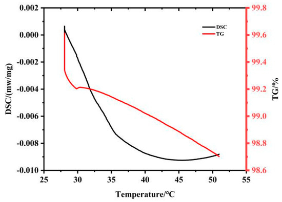 As seen in Figure 3, the heat flow curve is always less than 0, showing a trend of first decreasing and then increasing. It means that under the low temperature condition of 30~50 °C, the coal body has been in the state of heat absorption. A temperature of 30~50 °C in the coal body mass shows a decreasing trend, and the increase in the coal body temperature makes the small amount of oxygen-containing functional groups, side chains and other smaller molecular structures in the coal crack and contact with oxygen to generate volatile gas [20]. This leads to the decrease in coal mass.
