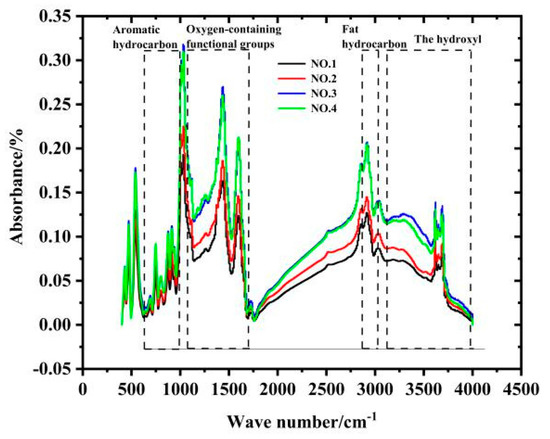 In order to more accurately analyze the source of CO in low-temperature environments, the effect of microstructural changes in the coal body was considered. The changes of the main functional groups in the coal body by water bath at different temperatures were investigated by infrared spectroscopy experiments, and the influence of temperature on the changes in the content of active functional groups in coal was analyzed using the infrared spectrograms of coal samples in tanks 1~4, i.e., raw coal, 30 °C, 40 °C and 50 °C water-bath-heated coal samples. The coal samples from jars 1 to 4 were taken out, crushed, sieved and dried under vacuum at 30 °C to obtain 5 mg of coal samples below 200 mesh by the KBr compression method (Coal sample powder was mixed with KBr powder in the ratio of 1:150 and poured into a bowl to grind and pressed into thin slices with a thickness of about 1 mm using a tablet press). The parameters of the experimental equipment were set as follows: The PoP scanning interval was 400–4000 cm−1, the resolution was set to 4.0 cm−1 and the IR spectra of each sample were scanned 30 times. The IR spectra of the raw coal and the coal samples treated with different temperature water baths were extracted separately, as shown in Figure 4.