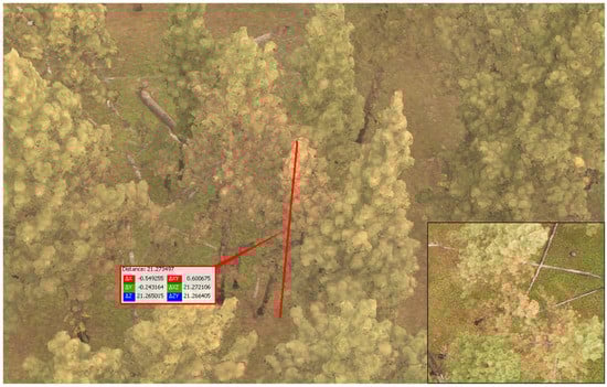 Point cloud derived from structure-from-motion (SfM) photogrammetry using images taken by the DJI X3 RGB camera. The same location is shown using an original X3 image (inset bottom-right). The red line depicts the process of manually identifying and measuring scorch height within CloudCompare software. The digital measurements were taken at the same locations as the field measurements to assess the ability to accurately map scorch.