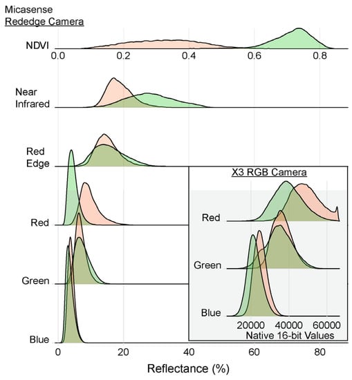Comparison of density distributions of band values for points identified as scorched needles (red) versus green needles (green) for the radiometric Micasense Rededge and standard RGB X3 cameras. The normalized differenced vegetation index (NDVI) was derived from the Rededge’s red and near infrared bands and used for subsequent classification of the point cloud.