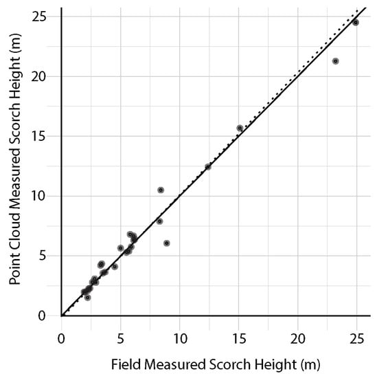 The field-measured scorch heights had an excellent correlation to the point cloud-measured scorch heights with a mean absolute error of 0.53 m, a mean absolute percentage error of 8.6% and an r-squared of 0.98 estimated by a linear regression (n = 29, Figure 3). This result should be viewed as optimistic because the field samples were selected for their ease of visibility and GPS accuracy. An analyst identified the corresponding scorched areas within the point cloud, which reduced XY positional errors, and the height measures were also relative metrics (i.e., distance between ground and canopy points), which did not account for any vertical positional error. Of note, scorch could not be identified for one point, which is a fundamental problem in SfM photogrammetry, where features are ‘missed’ or not produced in the point cloud most often caused by not being identifiable in multiple images []. The use of highly-visible and accurately geolocated GCPs is suggested and has improved the point cloud in every instance we have encountered. Even with these caveats, the mapping of scorch is viable and accurate from RPAS and SfM photogrammetry.