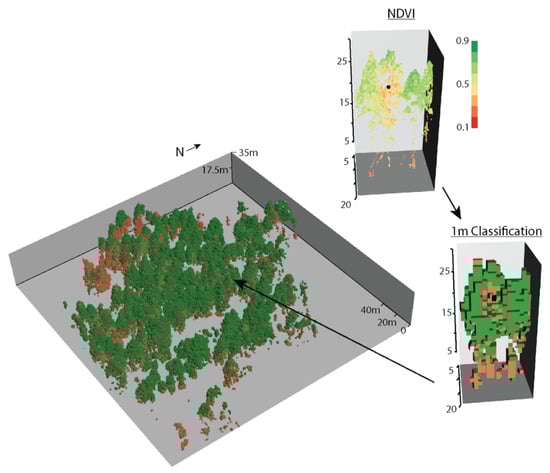 Following the distributions seen in Figure 2 from the RedEdge, a 1 m3 classified voxel map of scorch was developed with scorched voxels defined as at least 20% of observed points < 0.5 NDVI (Figure 4). With this classification, 20.3% of the canopy (e.g., ≥2 m in height) voxels were considered scorched versus 9.4% of the individual points. The method used here does produce a reasonable match to observed scorch but an extensive analysis of performance and refinement of the classification is necessary for application. Distinguishing leaf data points from branches, boles, and other material before classifying scorch would likely improve the final product with an application of machine learning classifiers being the upper end of methodological complexity [].