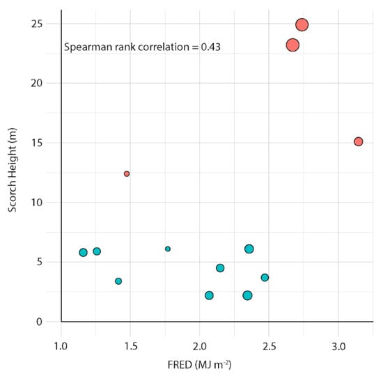 The 4 m radius, mean FRED fire behavior estimates had a Spearman rank correlation of 0.43 with the field-measured scorch heights (Figure 5). The number of viable samples was low (n = 13) and therefore any conclusions about the relationship between radiation energy output and scorch are difficult to support. In Figure 5 the point size is scaled by the number of canopy points underneath the scorch height to account for the amount of absorptive biomass (594–41,868 points). Conversely, maximum scorch heights that match the height of the corresponding tree does not represent the maximum potential scorch height, which occurred in one of the samples here but was significant in other areas of the prescribed fire. This is another confounding forest structure variable to consider when relating fire energy to scorch heights.