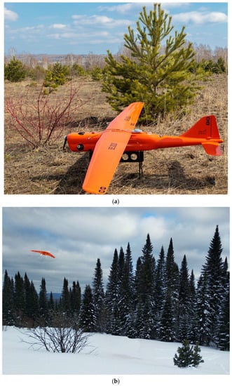 Drone Supercam S250 (fixed-wing aircraft): (a) flight preparation; (b) completing a wildlife monitoring task. The drone is launched with elastic or pneumatic catapult, landingby parachute with a line release system (photo from the KemSU collection).
