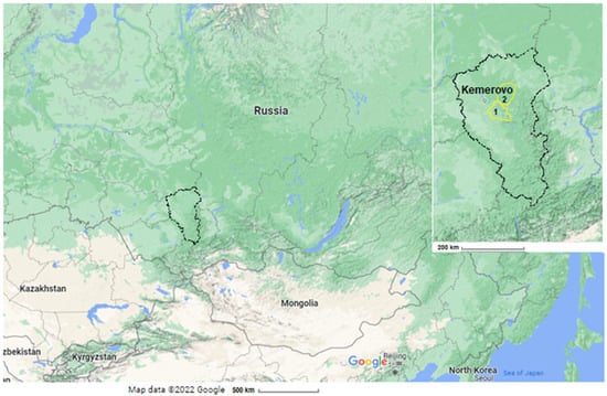 Monitored area: Kemerovo region—Kuzbass on the map of Russia. Source: https://google.com/maps//@55.4020429,80.4461703,5z/data=!5m1!1e4?hl=en (accessed on 30 March 2022): 1 and 2 are districts of the region where I, II, and III hunting grounds are located.