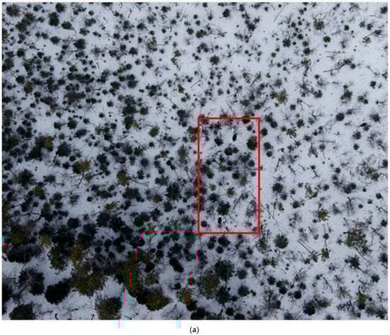 However, not everything is that simple. Hodgson et al. [] studied the effectiveness of such studies by counting life-size copies of seabirds arranged in groups in open spaces with a clear contrast with the environment. When the counted number of bird replicas was compared between the numbers obtained from drone imagery and ground imagery, drone counts were significantly more accurate [,]. We have obtained similar results in our wildlife monitoring studies (Figure 2, Table 1). We used an aircraft-type drone “Supercam S250” (LLC “Unmanned Systems”, Izhevsk, Russia) with a wingspan of 2.53 m (flight time—up to 3 h; flight range—up to 180 km; speed—from 65 to 120 km/h; permissible distance from the operator (radio line range of action)—50–70 km; flying height—from 50 to 500 m; permissible wind speed up to 15 m/s, air temperature from −50 °C to +45 °C, moderate precipitation (rain and snowfall) is possible) with cameras and a thermal imager, and for image processing we used the Thermal infrared object finder (TIOF) software developed by the staff of the KemSU Institute of Digitalization. Thermal imaging is reliable enough to determine the very fact of the presence of an animal provided that there is a significant difference in the temperature of the animal’s body and the environment (up to 30–40 °C), but it does not allow to distinguish species with similar mass and geometry of bodies. Adapted algorithms are required in this case to identify individuals of a specific species (Figure 3).