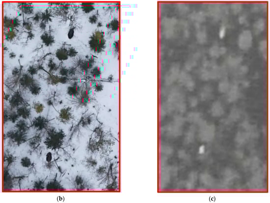 A shot in which the algorithm revealed two elk (red circle at the top of the shot) during a visual check: (a,b)—RGB photo fragments; (c)—IR image fragment. Survey altitude −250 m; drone flight speed—83 km/h; outside temperature—−15 °C; wind speed—8 m/s (photo from the KemSU collection).