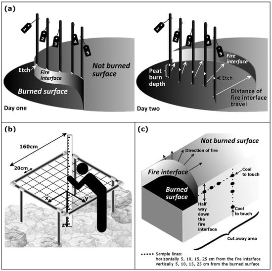 Before and after fire, peat surfaces were mapped using a 160 cm sampling square, with a 20 × 20 cm mesh grid, providing a repeatable matrix of 81 intercept points. The square was levelled, 1 m above the nominal peat surface. Four metal rods were inserted into the peat adjacent to each grid corner to mark exact locations. Each rod was etch marked at the pre-fire peat surface. Grids were set up just ahead of peat-fire interfaces in the direction of prevalent fire movement. At each intercept point, a measuring pole, orthogonal to the sampling matrix, was used to measure distance (z) to the unburnt peat surface, providing x, y, z peat surface measurements (Figure 3b and Figure 4b). This was conducted at one or two positions ahead of peat-fire interfaces at each FSE location. Several days later, after fire had passed through the mapped locations and stopped burning vertically down into the peat, sampling squares were re-established at the precise locations, orientation and height, using the metal rods that had been left in place with the original peat surface etch marks. All x, y, z points were re-measured for the post-fire peat surface.