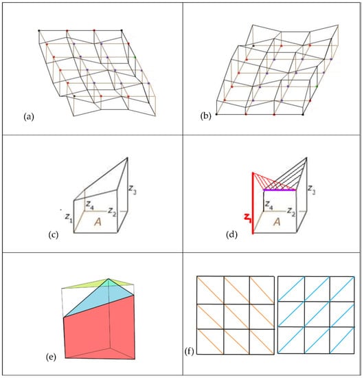 Measuring peat volume loss: (a) illustration of volume between the sampling grid (uppermost) and peat surface, (b) diagram in (a) flipped vertically—peat surface now uppermost (c) illustrated grid square volume calculations of a single prism by linear interpolation between the four corner heights when the peat surface is flat and (d) irregular, (e) volume of a truncated right triangular prism, (f) subdividing the square-based prisms from left to right, creating left-to-right triangular prisms, and then right-to-left-to triangular prisms. Illustrations (a–d) from (and modified from) [].