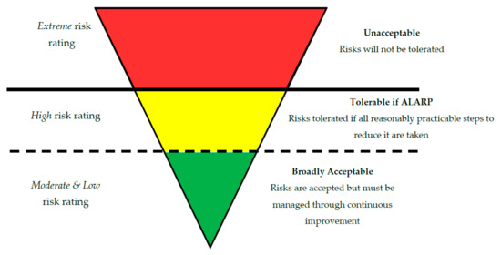 Organisations are required to implement a risk-based approach to eliminate or minimise risks to create a safe workplace [20]. Where risks cannot be managed to a broadly acceptable level, they may be tolerated if they are reduced to “as low as reasonably practicable” or ALARP [21], noting the terms “practicable”, “so far as is reasonably practicable” and “ALARP” are at times used interchangeably within the Australian context, with ALARP being the most commonly accepted term within industry and academic contexts [20,21,22,23,24]. The ALARP principle requires that all effective safeguards, including best practices, which could be implemented without disproportionate cost or risk (those that are reasonably practicable), are implemented [22]. Such processes are used in many different arenas; however, the term ALARP may not be so commonly used.