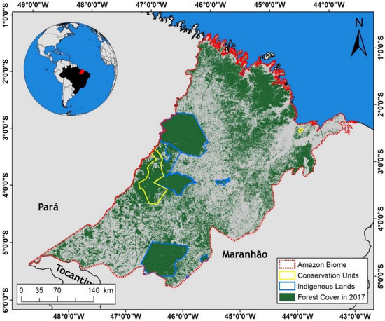Map of the study area (the Amazon biome in Maranhão state). Forest cover from the MapBiomas project [41].