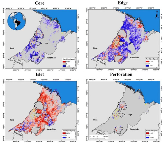 Spatial trends (Sen’s Slope estimator) for each fragmentation class between 1985 and 2017 in the Amazon region of Maranhão, Brazil. Areas were calculated in pixels with 10 km spatial resolution. Negative values (in blue) represent the decrease trend, while positive values (in red) represent the increase trend.