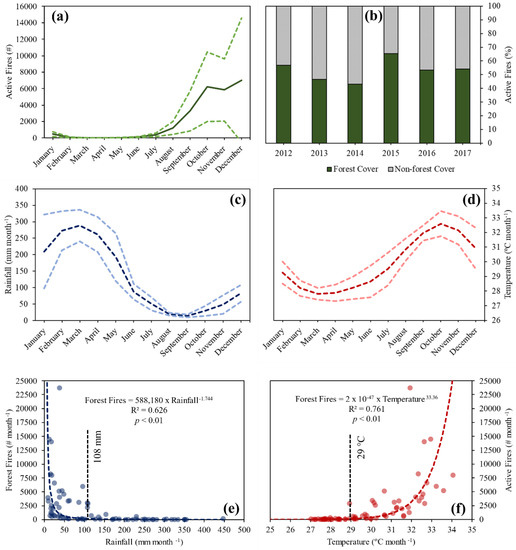 (a) Average monthly pattern of active fires in forest cover areas for the 2012–2017 period in the Amazon region of Maranhão, Brazil. (b) The proportion of active fires registered annually in forest and non-forested cover during the 2012–2017 period. (c) The monthly average rainfall in the 2012–2017 period. (d) The monthly average temperature in the 2012–2017 period. (e) Regression of the relationship between the monthly average rainfall and the monthly total number of active fires in forest cover in the 2012–2017 period. (f) Regression of the relationship between the monthly average temperature and the monthly total number of active fires in forest cover in the 2012–2017 period. The dashed lines in lighter colors in Figure 4a,c,d represent the standard deviation for the 2012–2017 period.