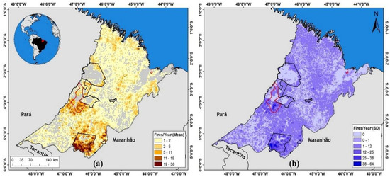 (a) Hot spot annual average for the 2012–2017 period in the Amazon region of Maranhão, Brazil. (b) Hot spot standard deviation for the period 2012–2017. We quantified active fires in pixels with 10-km spatial resolution.