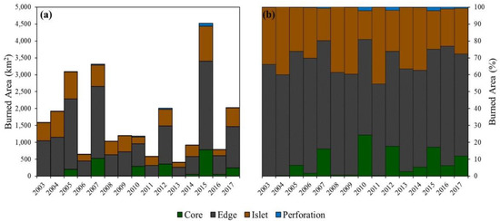 Areas in the edge fragmentation class experienced the greatest extent of burned areas. An average of around 1031 ± 695 km2 on forest edges burned per year in the region between 2003 and 2017, the equivalent to 61 ± 5% of the total burned forest cover in the study. The second fragmentation class with the greatest extent of forest fires was the islet class, with an annual average of 466 ± 253 km2 year−1 burned between 2003 and 2017, the equivalent to 31 ± 8% of the total burned forests. An average of around 169 ± 227 km2 of the forests core class burned annually during the study period (about 7 ± 8%), while only 13 ± 24 km2 (about 1 ± 1% of the total) of the perforation class burned per year. During the studied period, 2015 was the year with the greatest overall burned forest extent, and the year where each fragmentation class experienced its highest burned area extent (Figure 6a). Results from the trend analysis showed no statistically significant trend (p > 0.05) in burnt areas during the period 2003–2017 (Kendall’s tau: core = 0.276; edges = −0.086; islands = −0.181; and perforation = 0.276).