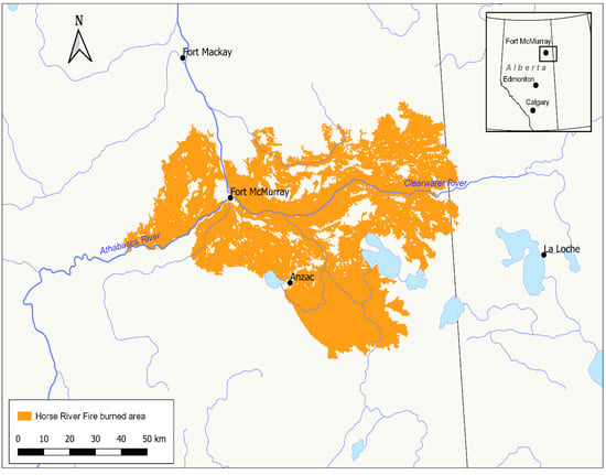 The Horse River wildfire of May 2016 was one of the largest wildfire incidents in Canada with wide ranging social, economic, and environmental impacts. The fire (2 hectares) was first spotted on 1 May. Within three days, aggravated by the prevailing strong wind (43 KM/hr) and an unusually hot season (recorded daily temperature reaching up to 35 C), the wildfire quickly covered thousands of hectares (~157,000 ha), jumped the Athabasca River, and impacted most parts of the city. More than 88,000 residents of Fort McMurray were forced to evacuate with little notice including the evacuation of First Nations and Métis communities in the Regional Municipality of Wood Buffalo (RMWB). When the wildfire was finally under control by mid June, it had burnt an estimated area of ~ 590,000 ha (Figure 1). The damage from the wildfire was recorded as the costliest insured disaster in recent Canadian history [1]. It destroyed more than 2500 homes and damaged many more dwelling units and business establishments [2,3,4]. Overall, the wildfire resulted in an estimated $3.6 billion in insurable loss [1]. Commercial and personal damages from the wildfire are estimated to be $6 billion [5].
