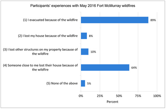 The majority of study participants had gone through a direct fire experience during the Horse River wildfire. Eighty-nine percent (89%) of the respondents were evacuated, 8% lost their home, and 10% reported they had lost other structures on their property because of the wildfire. Even if they had not experienced any property damage due to the wildfires, close to 2/3 of the study participants reported someone close to them lost their house because of the wildfire. Out of the 496 study participants, only 5% reported they did not directly experience the Horse River wildfire (Figure 2).
